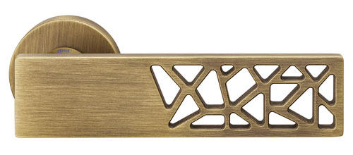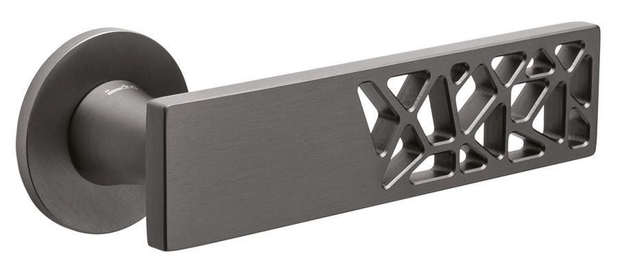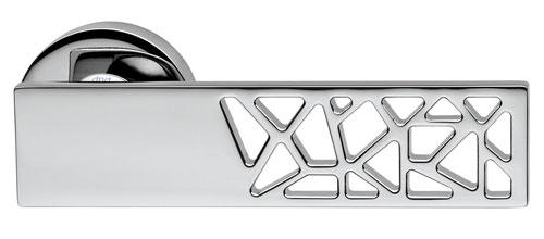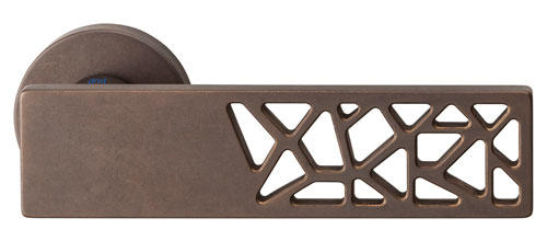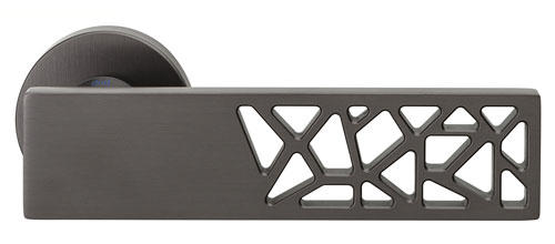 Klamki wykonane w precyzyjnie kwadratowej powierzchni, rozjaśnionej małymi trójkątnymi wycięciami, nadającymi jej dekoracyjny charakter.