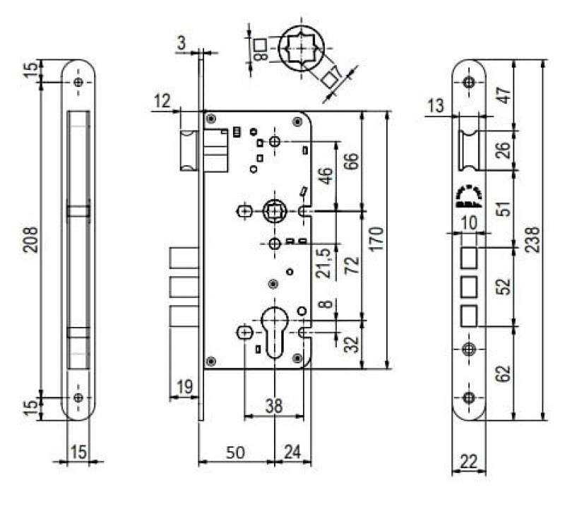 | Opis produktu | Wymiary zamka: listwa czołowa: długość: 238 mm, szerokość: 22 mm. Wymiar kasety: wysokość: 170 mm, szerokość: 74 mm. |