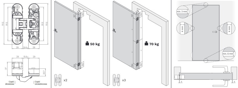 | Nośność dla 3 zawiasów (kg): | 70 |