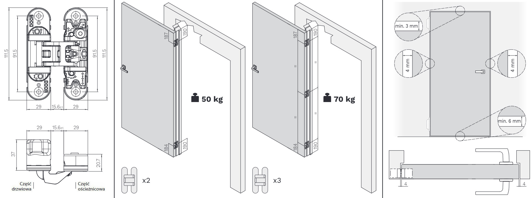 | Opis produktu | Nośność dla 2 zawiasów 50 kg, dla 3 zawiasów 70 kg, minimalna grubość drzwi 40 mm, 5 osi obrotu, drzwi bez rygli, materiał drzwi drewno |